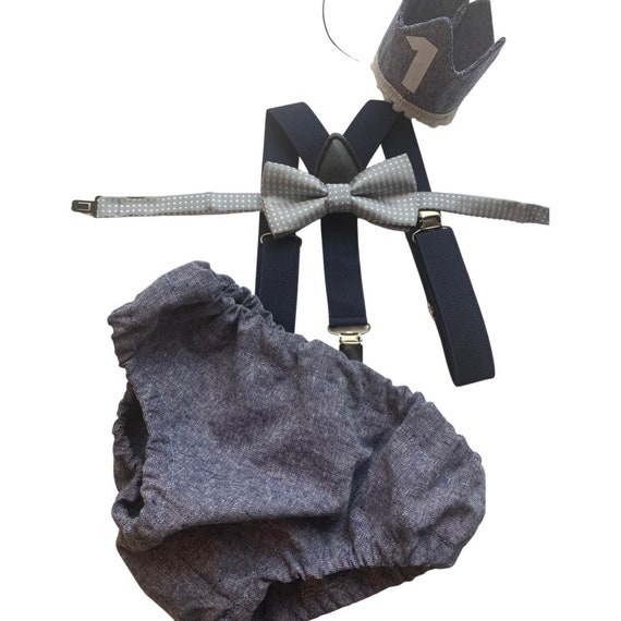 Smash Cake Outfit Boy Birthday Navy Blue and Gray Outfit 1, 2, 3 or 4 Piece Set Diaper Cover Tie Gray Suspenders Party Hat Bow Tie Bloomers