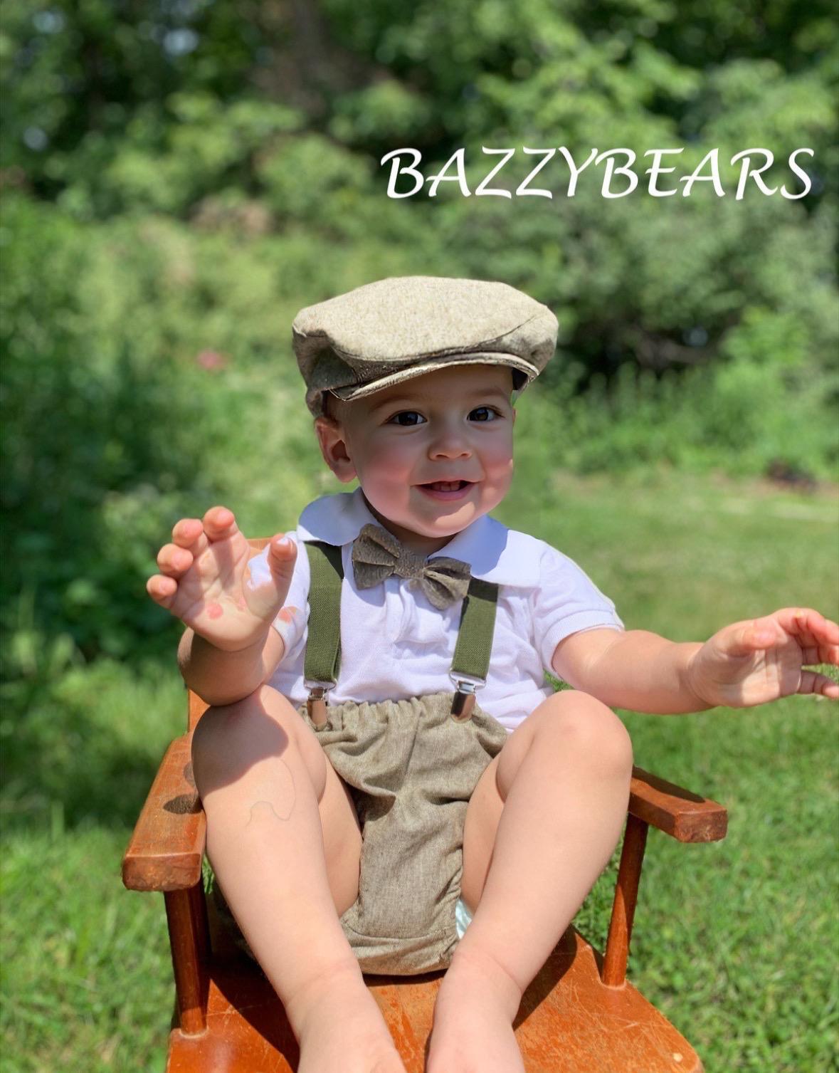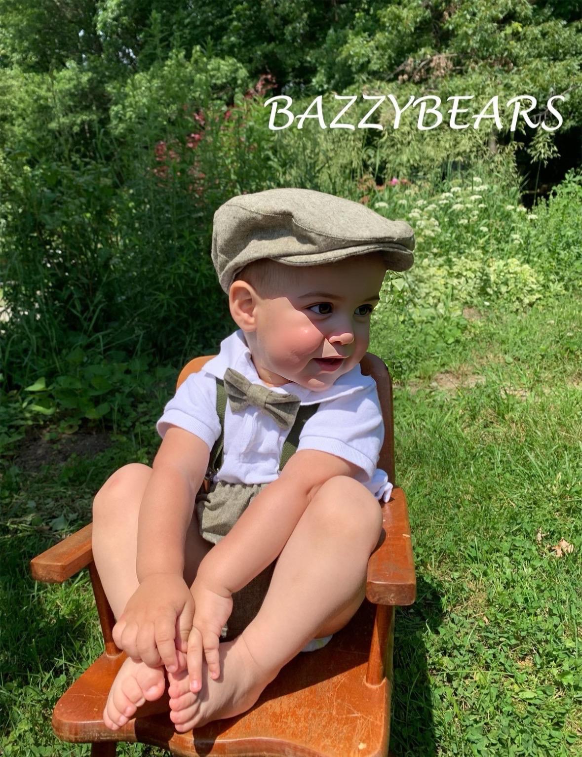 4 piece baby boy Baby blue set: bow tie, army green suspenders, hat and matching bloomers