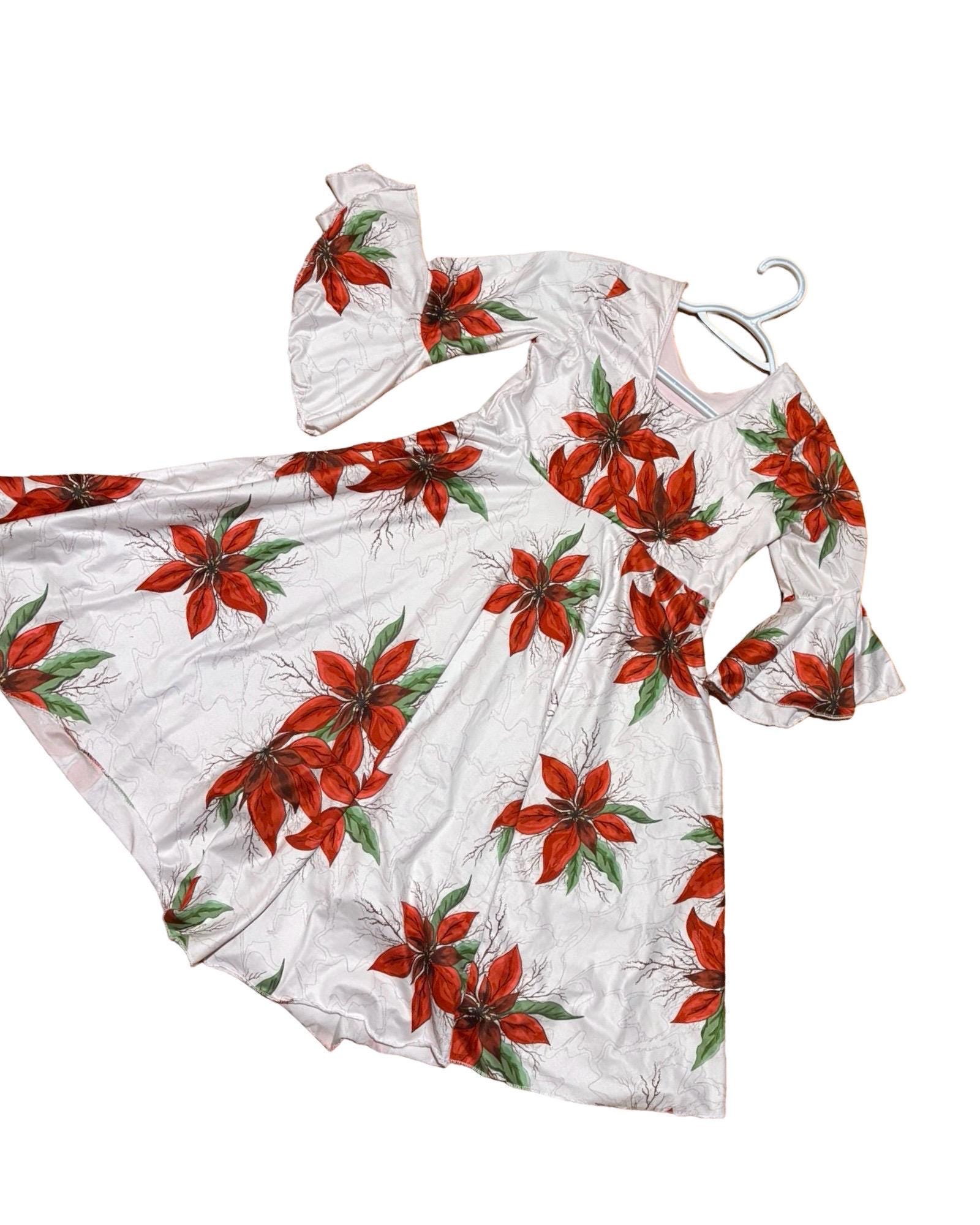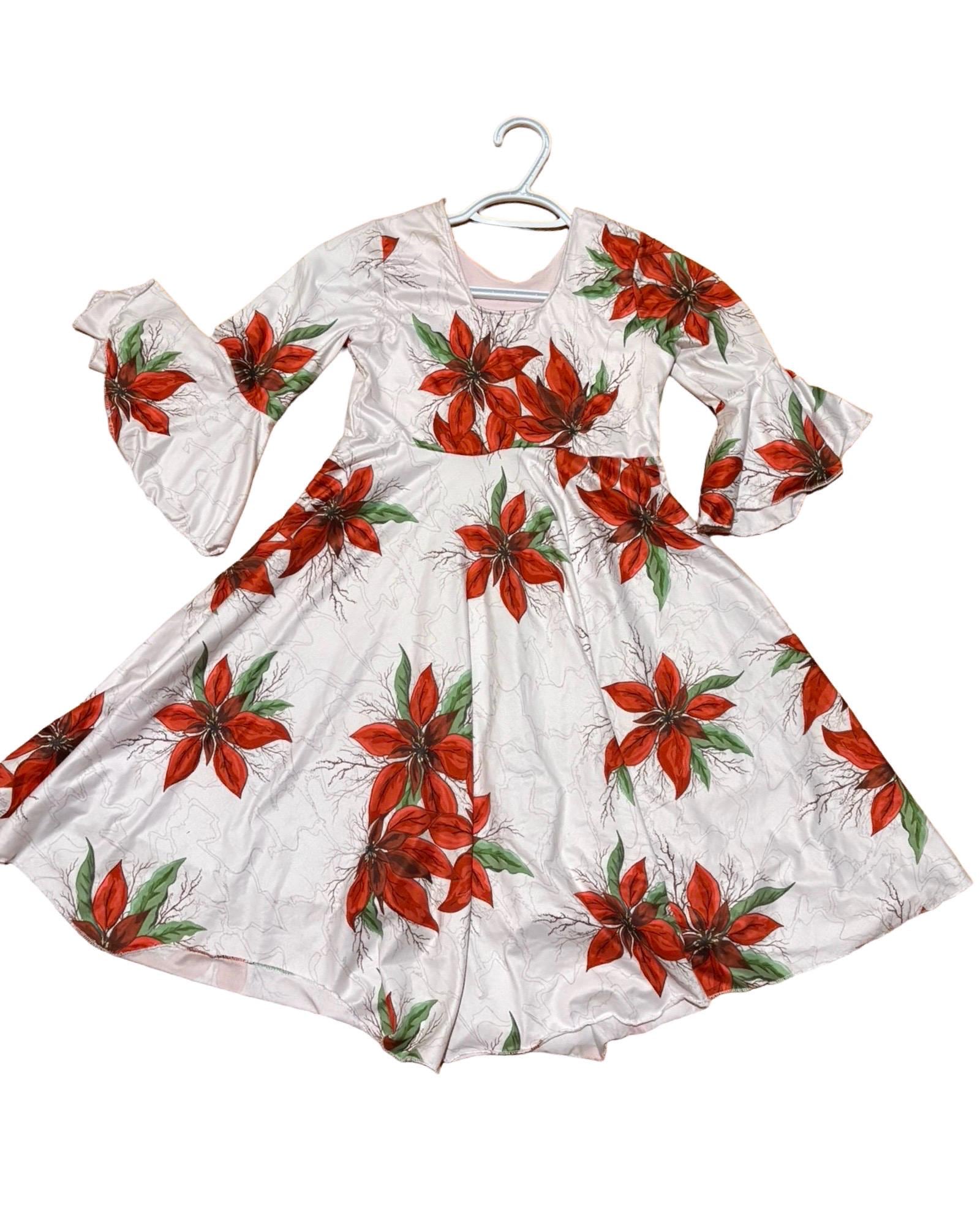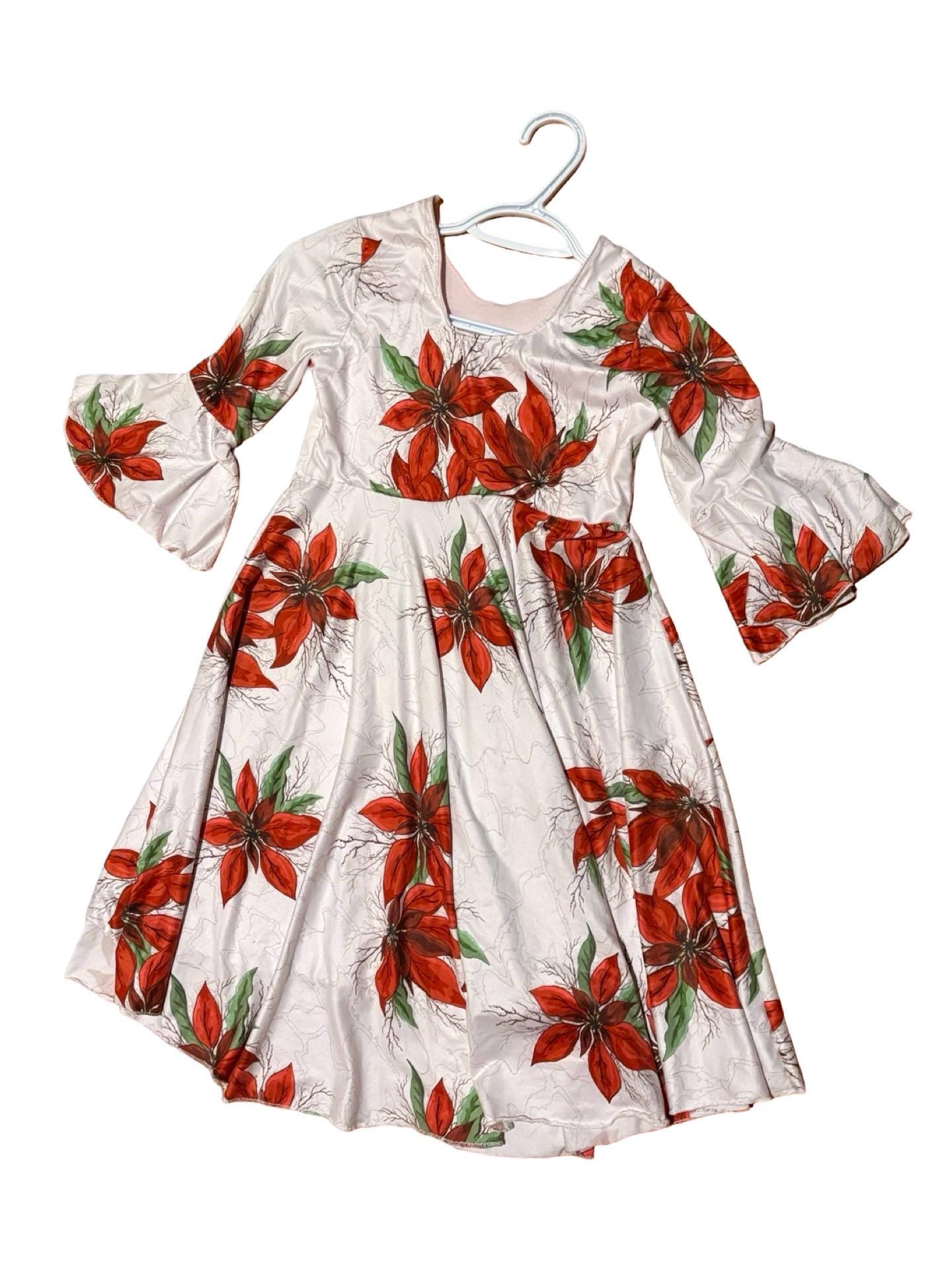 This original dress has a twirling skirt - perfect for lots of movement and comfort. At the top of the dress you have a 3/4 sleeves with a flare. At the bottom a full skirt that dips just below the knees. It is covered by beautiful pointsettias. A beautiful Christmas dress for a very special little girl! Comes with a matching bow .