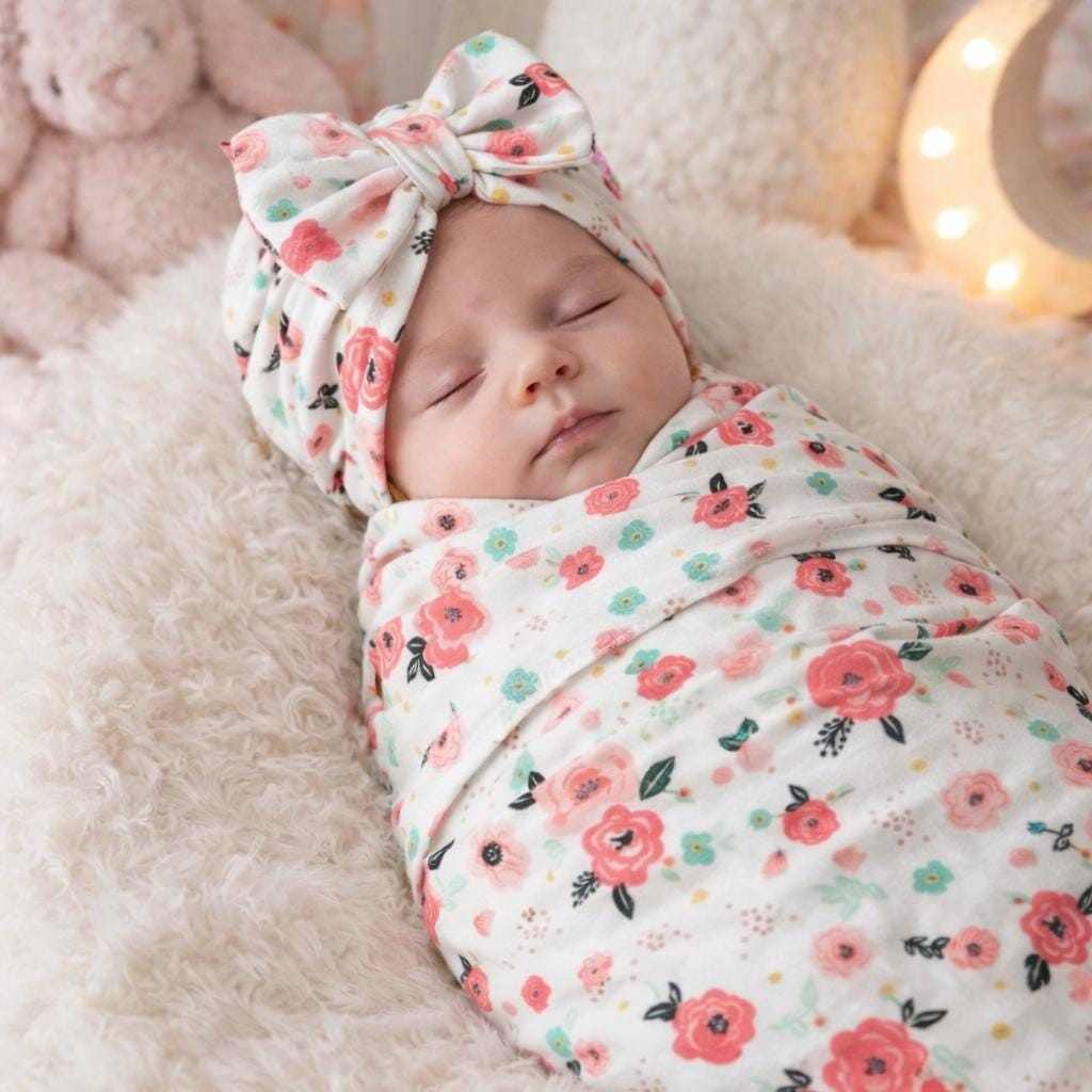 Swaddle Set in Garden Floral with Bow Turban, bow Hat & Bow Headbands set stretchy soft vintage bamboo cotton baby girl summer winter