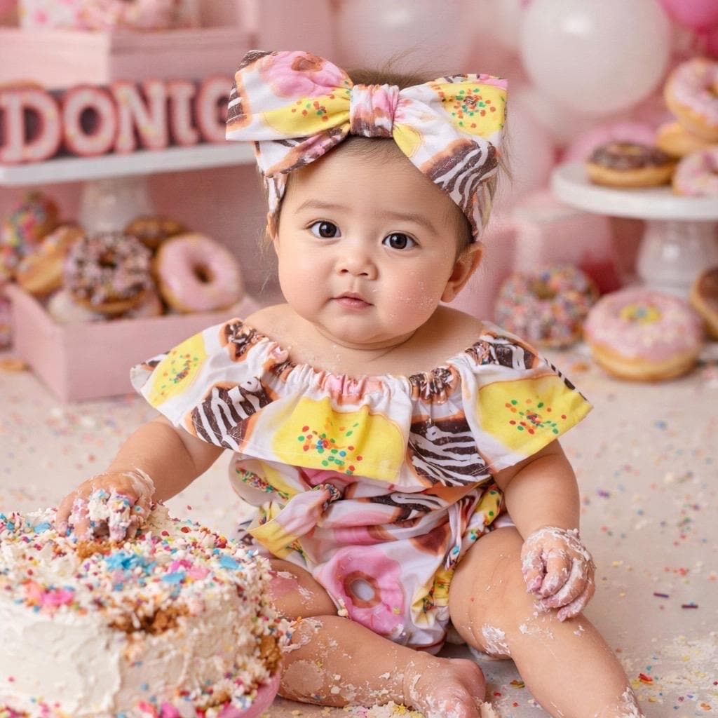 This original DONUT ruffle romper is made out of 100% cotton fabric- perfect for photos. It comes with a sash and an option to purchase a headband. A beautiful ruffle romper for a very special little girl!
