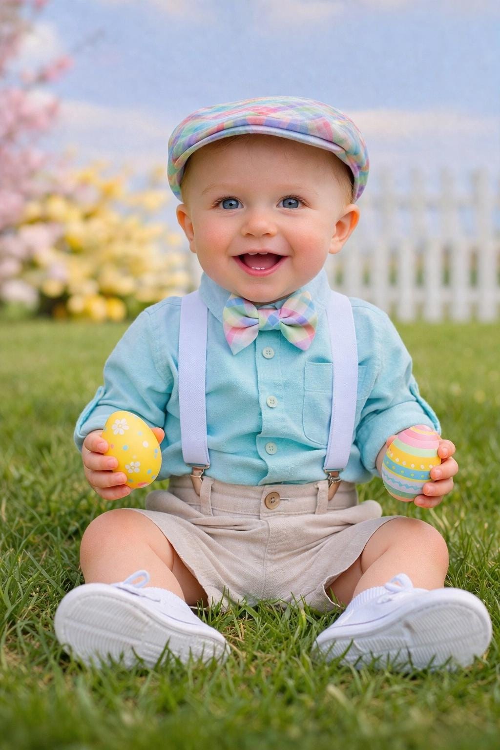 This newspaper boy cap with matching bow tie and suspenders is custom made just in time for Spring. It is made of 100% cotton for easy cleaning. Excellent quality with 100% cotton fabric.