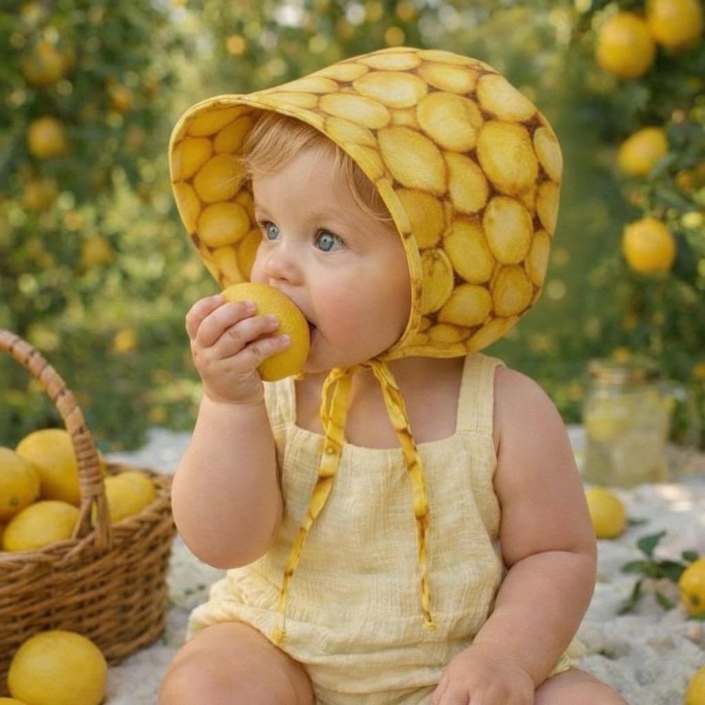 Bonnet has fruit on one side and solid colour of the same shade on the other side. Example: if one side is lemons, other side is solid yellow of the same colour.