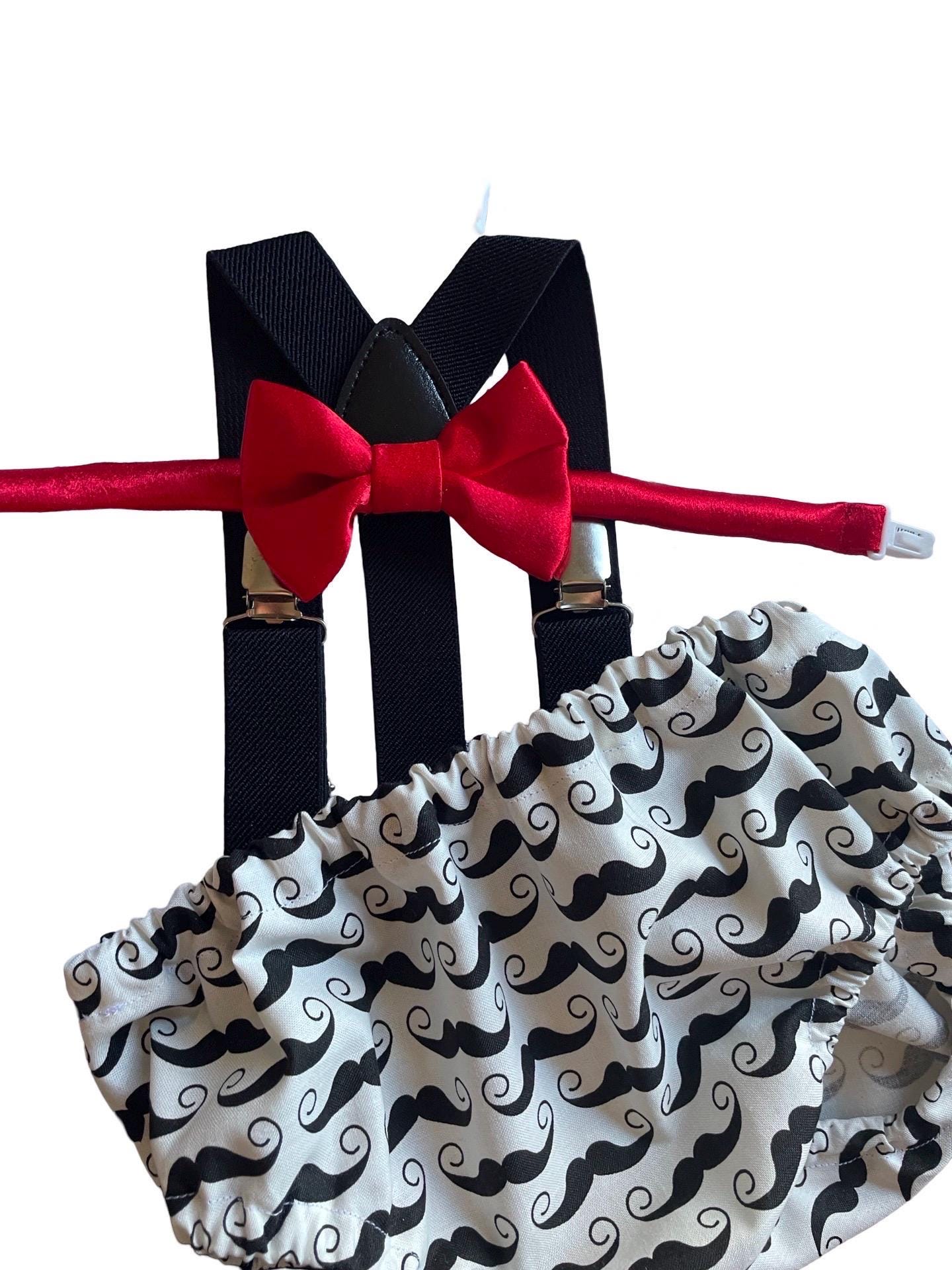 3 piece baby boy Cake Smash set: black suspenders, red bow tie and bloomers