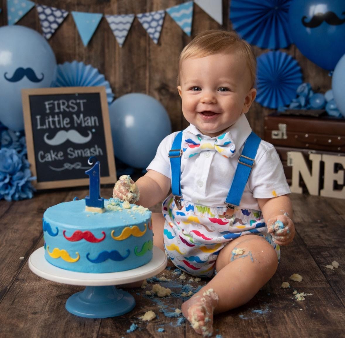 3 piece baby boy Cake Smash set: black suspenders, moustache bow tie and bloomers