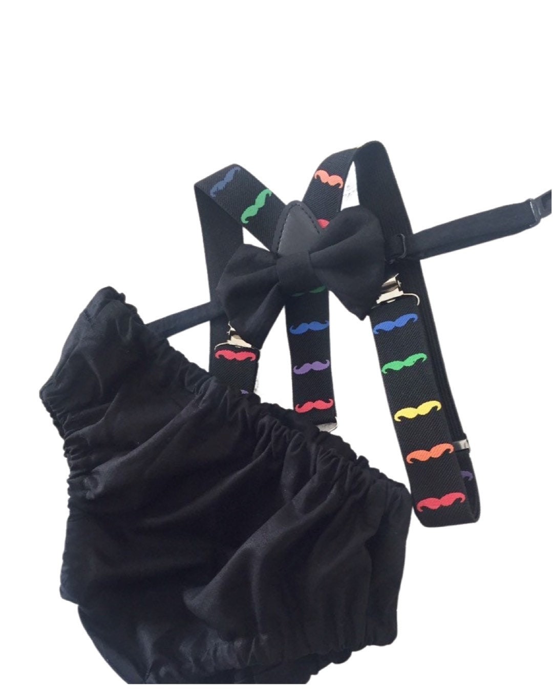 3 piece baby boy Cake Smash set: moustache suspenders, black bow tie and bloomers