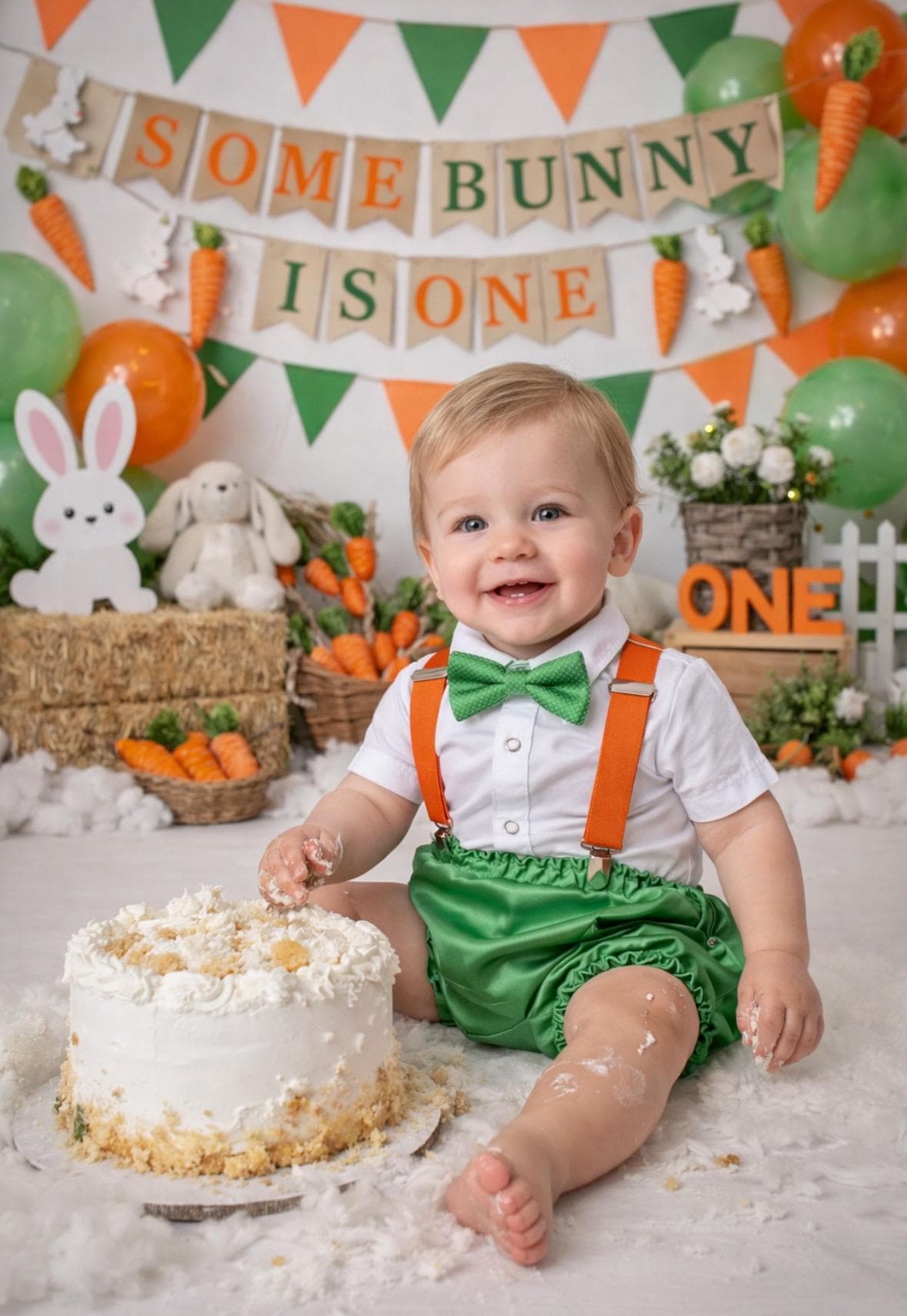 3 piece baby boy Cake Smash set: orange suspenders, green bow tie and green bloomers