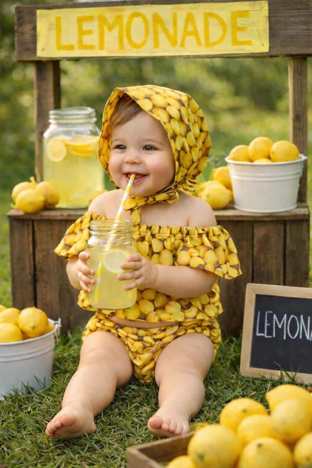 3 piece baby girl set: Bonnet, off shoulder top, lemon bloomer