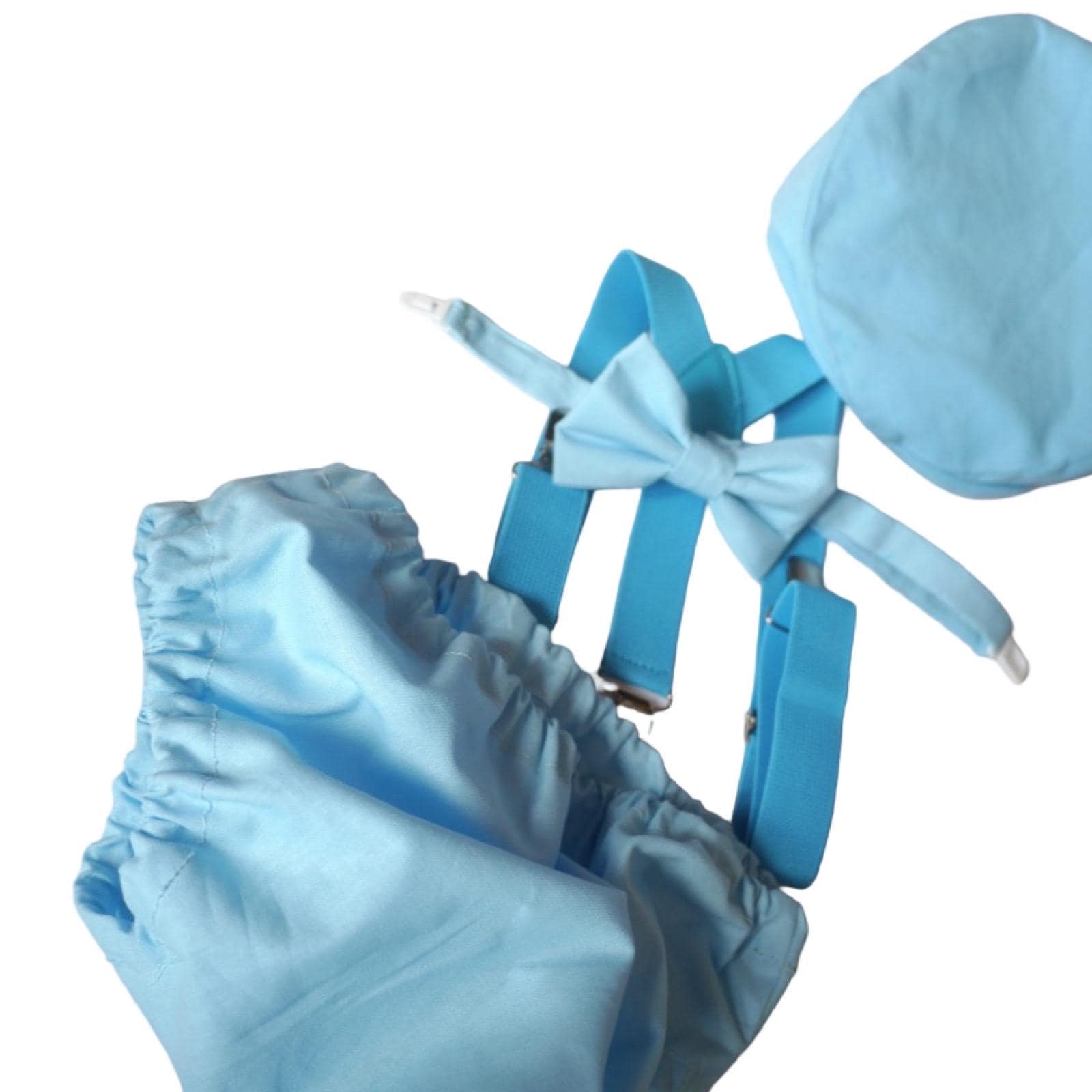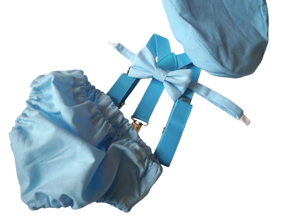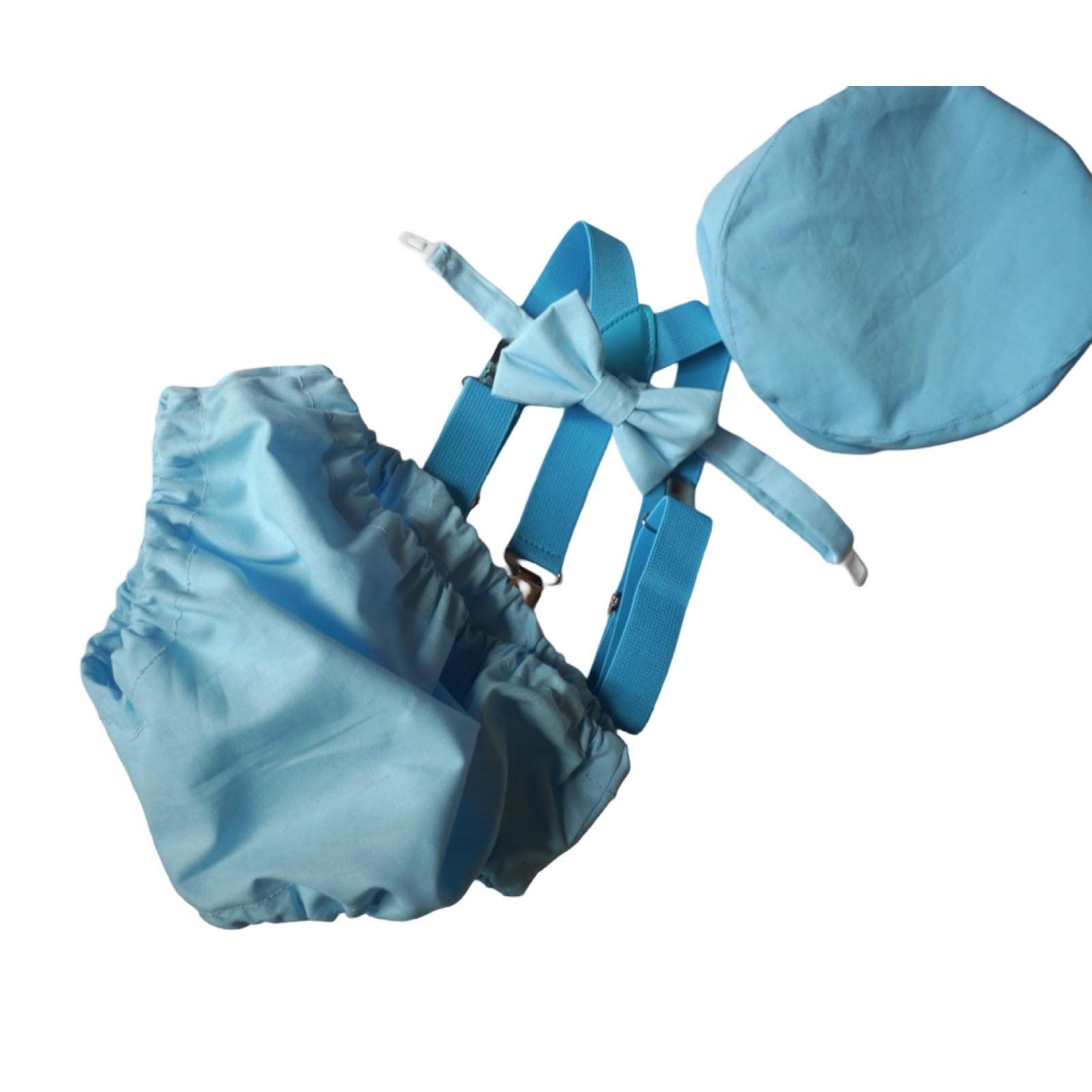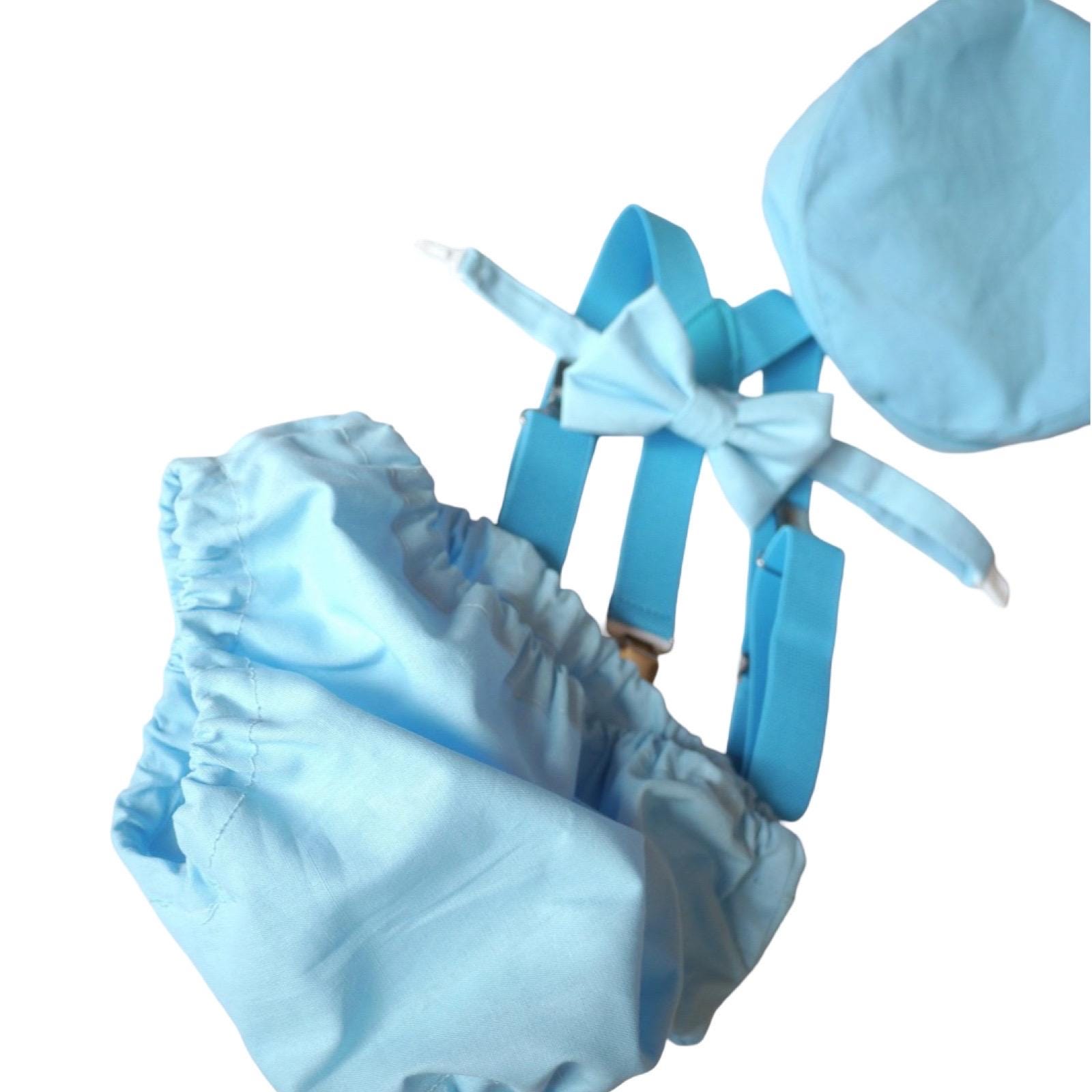 4 piece baby boy Baby blue set: bow tie, blue suspenders, hat and matching bloomers