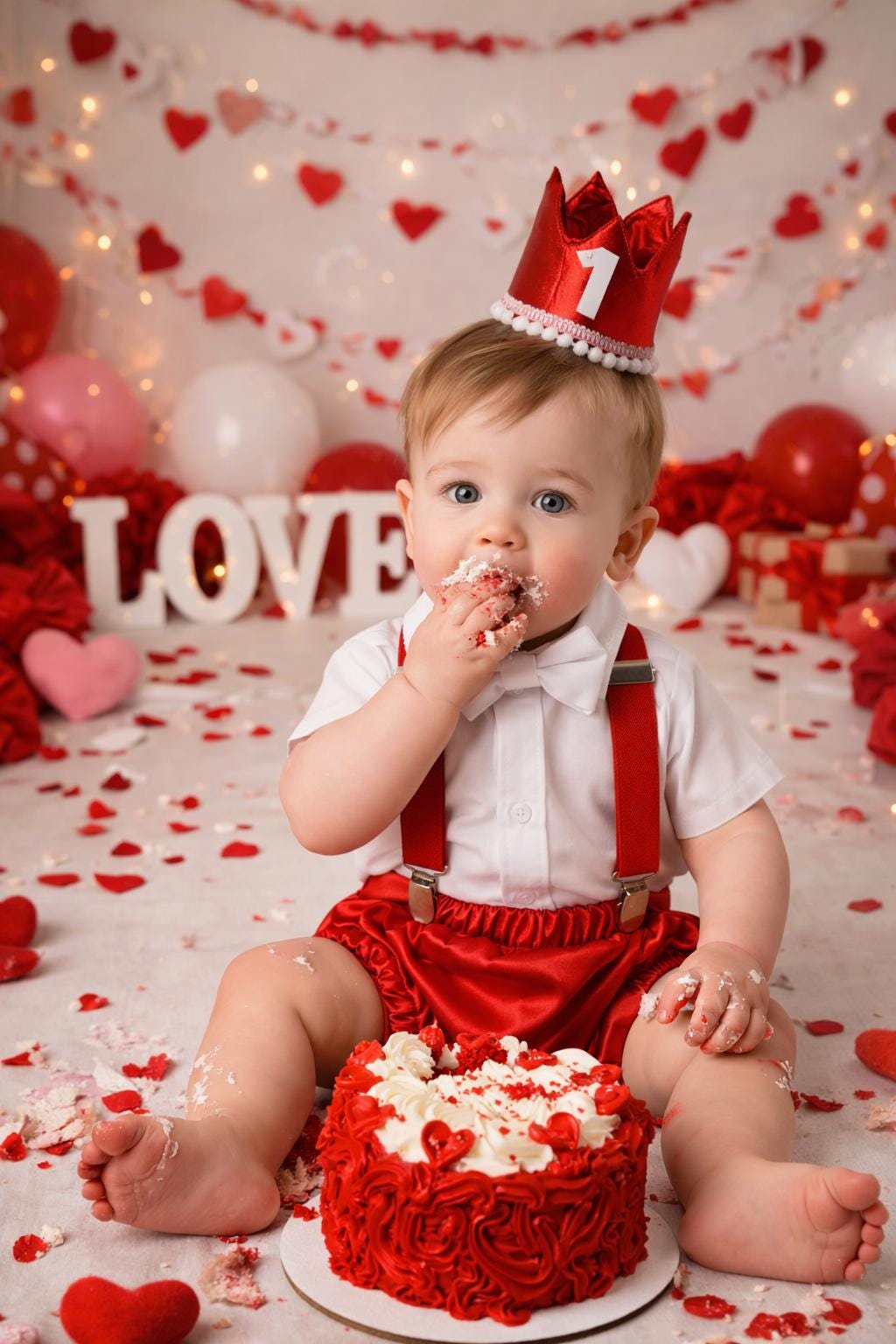 4 piece baby boy Cake Smash set: red suspenders, white bow tie, crown and bloomers